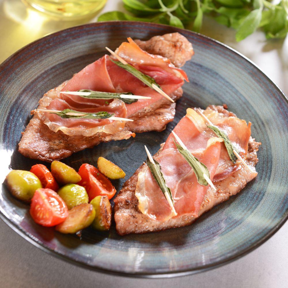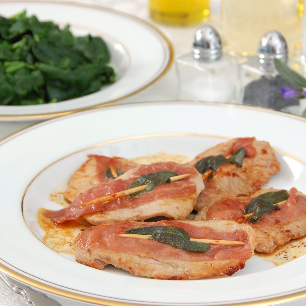Prosciutto crudo must be thinly sliced and well balanced, not overly salty or aged. Its role is to enhance the veal, not dominate it. Fresh sage leaves bring aromatic depth and a slightly earthy note that defines the dish.